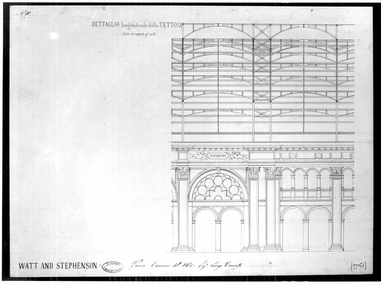 Sezione parziale della galleria della stazione: inf. archi d'accesso al ristorante (nella cornice è scritto in un riquadro "Ristoratore"). Sup. strutture della tettoia.