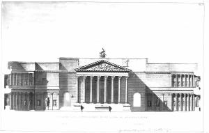 Sezione trasversale del Foro, con prospetto del tempio di Marte e sezione degli degli emicicli laterali. Disegno a simmetria assiale verticale; colorato a bistro grigio. Le murature in sezione hanno campitura rosata, le statue azzurra. Al centro: tempio octastilo con colonne scanalate dal capitello corinzio, sormontate da trabeazione con fregio liscio e timpano effigiato coronato da gruppo scultoreo. Ai lati, nella muraglia del Foro, archi di ingresso e parete liscia ornata da un ordine di paraste con capitello e trabeazione corinzie. Il motivo stilistico prosegue nel colonnato a 2 pp. delle adiacenti esedre.