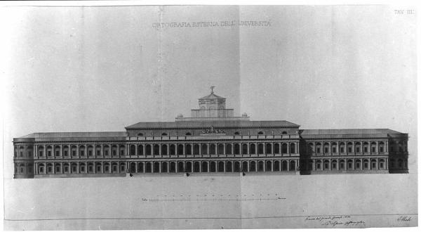 Prospetto principale di un edificio a china, bistro su cartoncino. Veduta del fabbricato a 2 piani, dell'ingresso centrale porticato e del loggiato superiore concluso da una balconata con gruppo scultoreo. Veduta di un corpo di fabbrica terminante in una torretta.