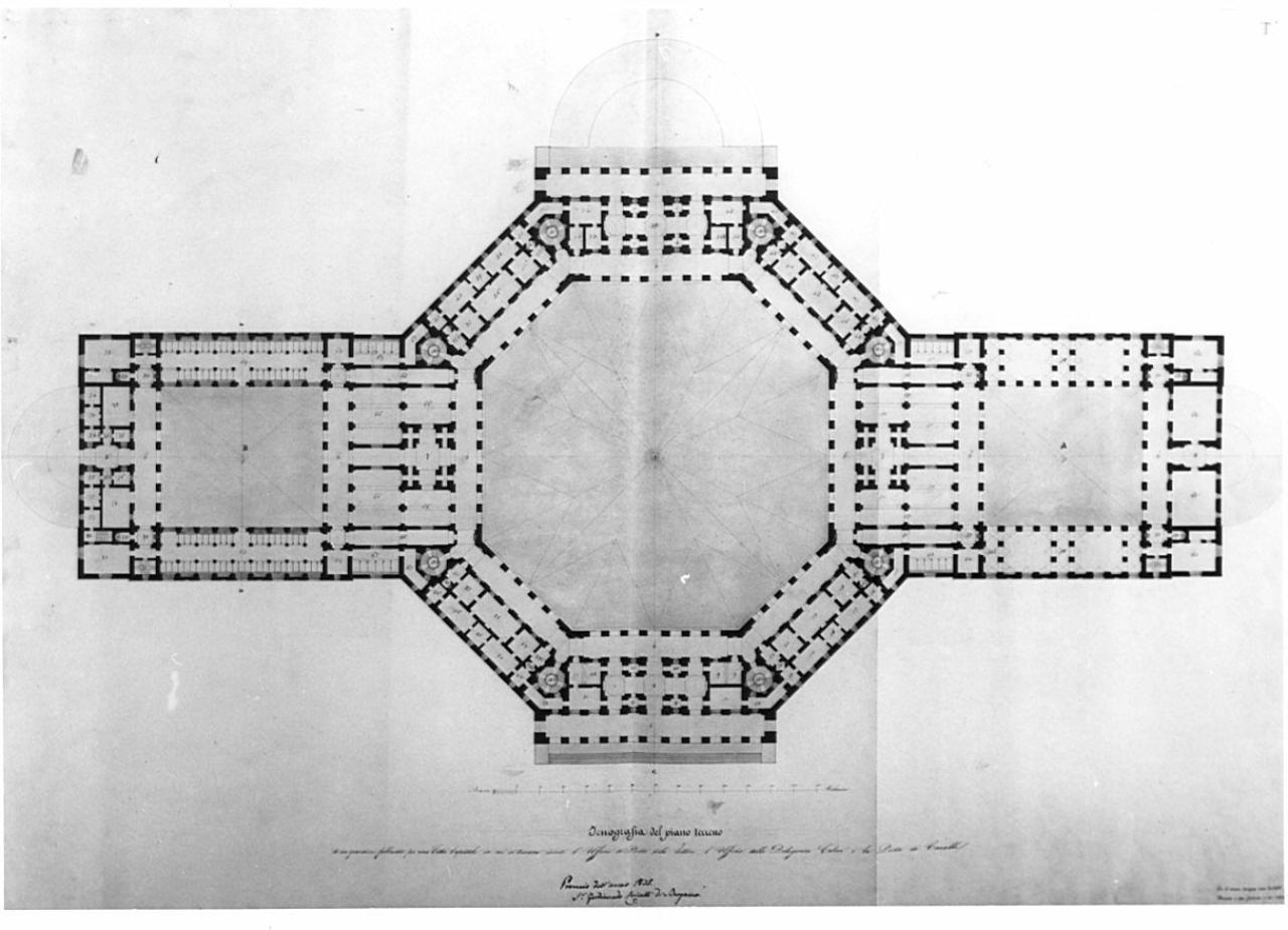 Pianta del piano terreno a china, bistro e acquerello rosa e azzurro, con numeri di riferimento ad una legenda in china rossa. Edificio a pianta centrale con ampio cortile ottagono al centro e due ali laterali con corti rettangolari. L'ingresso è preceduto da una gradinata e porticato.