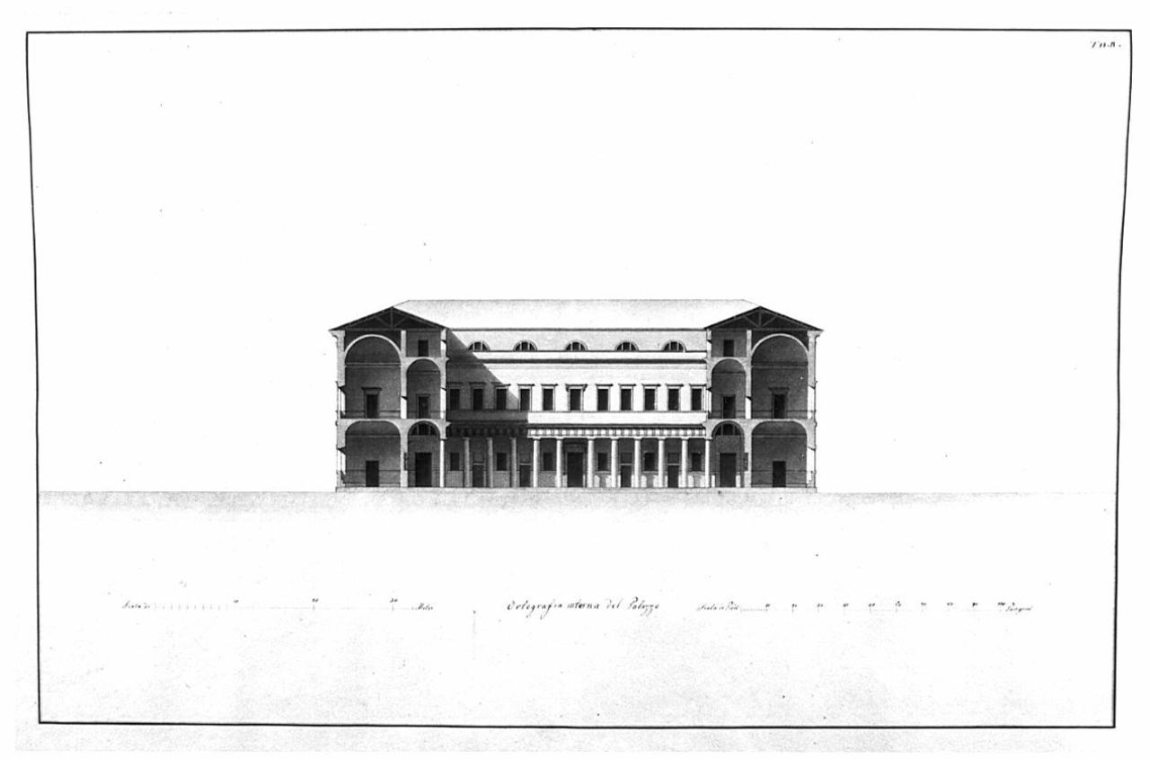 Sezione di un edificio a china, bistro e acquerello rosa, azzurro e beige, entro linea di margine a china nera. Sezione in mezzeria del cortile con vista del prospetto interno del palazzo con piano terreno in ordine tuscanico, dorico, piano nobile liscio con finestre rettangolari architravate e piano attico con finestre termali. Sezione dei corpi perpendicolari al prospetto con vista degli ambienti interni, sezioni delle murature in acquerello rosato. Sezioni delle capriate in acquerello marroni.