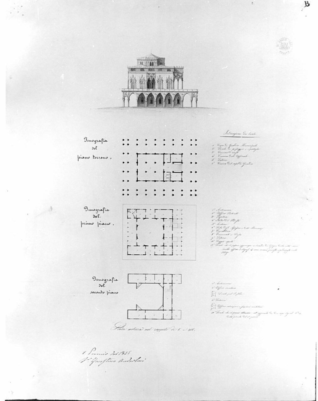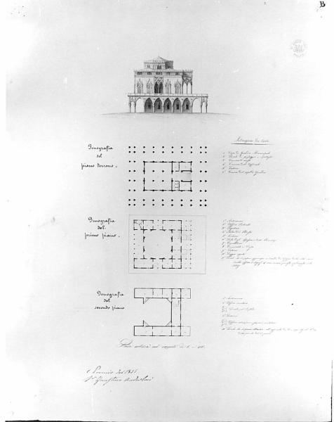 La tavola contiene: il prospetto di un edificio di stile neogotico a china, bistro e acquerello azzurro (sup. centro) e 3 piante al p. terreno, al primo e al 2° piano di edificio con murature campite a china. Sup. edificio a 3 piani con porticato ad archi acuti al p.t., bifore polilobate e terrazza con balaustra al primo piano e sup. torretta poligonale con archi polilobati e tetto a padiglione. Pianta del p. terreno di edificio rettangolare, circondato da doppio peristilio di colonne: pianta del I piano di edificio rettangolare con sala quadrata centrale e vani di forma regolare intorno; pianta del piano sup. di edificio a forma di U, con corpi sporgenti con murature campiute in inch. rosso.