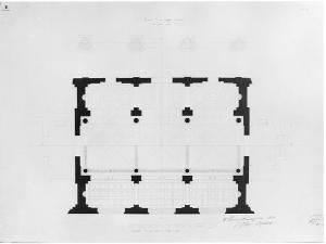 Pianta di parte di edificio (atrio e vestibolo di ingresso alle scale) con murature a china, aperture a bistro e linee di sezione in inchiostro rosso (AB-CD). Pianta con vista parziale delle proiezioni dei soffitti (metà inferiore) e disegno dei pavimenti (metà sup.). Atrio rettangolare con 3 aperture sul lato lungo, diviso in 3 settori da colonne. Sup. ambulacro delimitato da colonne. Al centro dei lati inf. a ds. e sin. accesso a vestiboli rettangolari absidali dai quali si accede alla scala.