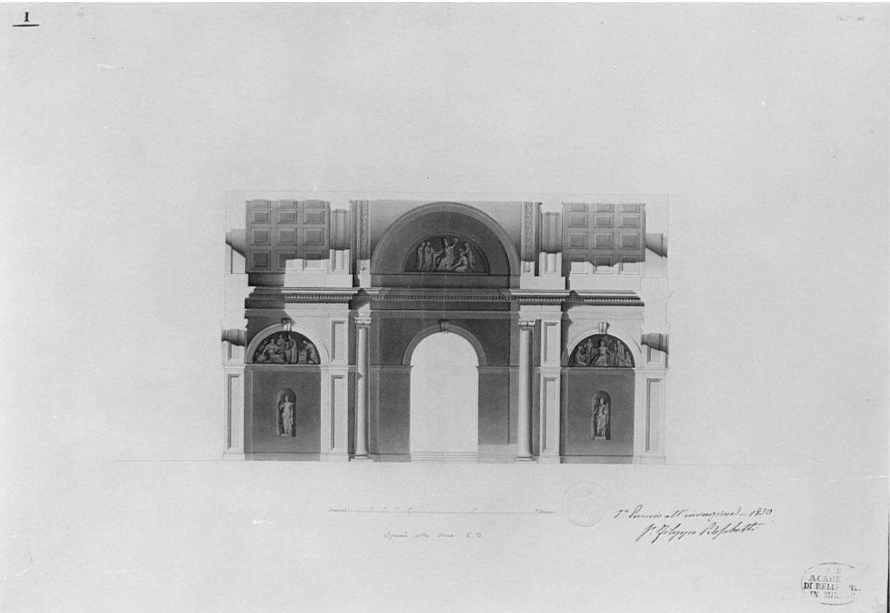 Sezione di parte di edificio (vestibolo di accesso alla scala) a china, con ombreggiature più scure e murature sezionate campite in acquerello rosa. Corpo ad unico piano, al centro arco sormontato da lunetta decorata con bassorilievo. Lat. 2 colonne ioniche addossate a pilastro. A ds. e a sin. vani con copertura piana cassettonata. Inf. arco con nicchia con statua, al centro e sup. lunetta decorata a bassorilievo.