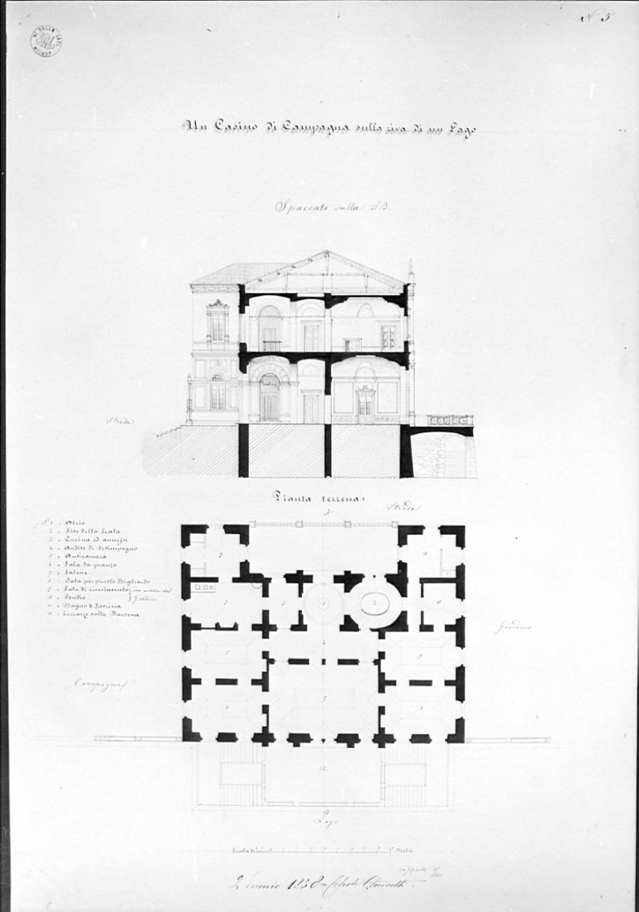 Progetto di un casino di campagna in riva al lago. architettura: casino di campagna (pianta e sezione)