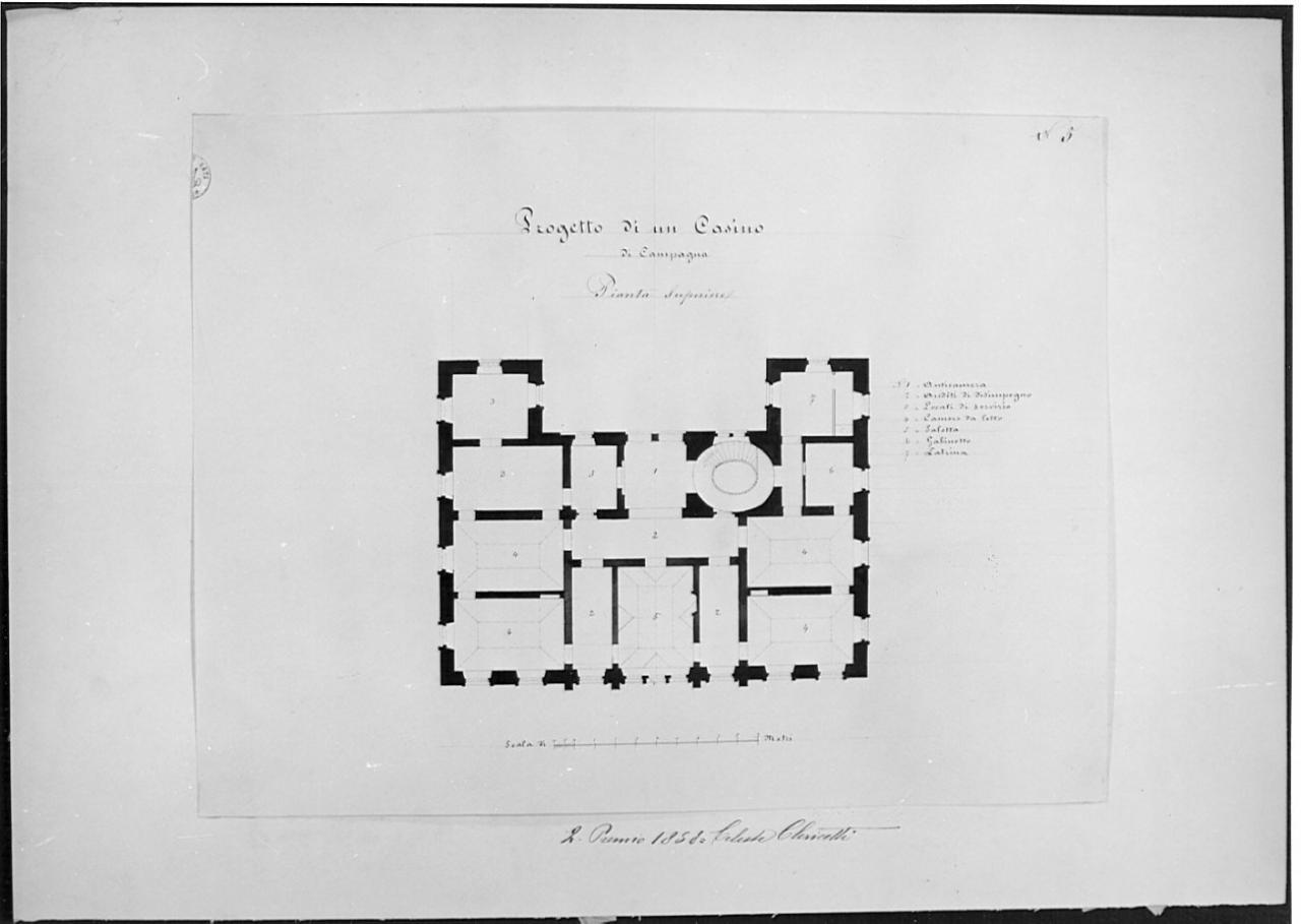 Pianta del piano superiore di edificio a china con numeri di riferimento a legenda posta a ds. del disegno. Edificio simmetrico, con ali aggettanti sul lato sup. All'interno serie di vani rettangolari. Scala elittica posta a ds. dell'anticamera (posta al centro del lato sup.) che distribuisce i locali del piano superiore.