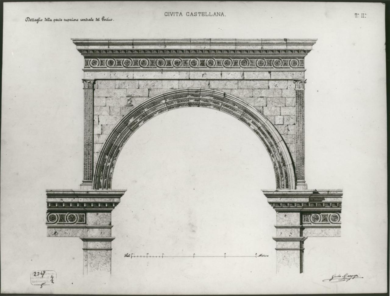 - NOTIZIE STORICO CRITICHE Il disegno appartiene ad una serie di tavole redatte da Monguzzi Giulio come probabile saggio di concorso triennale. Le tavole sono contenute in una cartellina originale recante le seguenti iscrizioni a penna: "Pensione Oggioni", "Saggi dell'anno 1° del pensionato di architettura / di Giulio Monguzzi / da restituirsi al medesimo dietro ordine della Presidenza / di questa R. Accademia", "N. 5 tavole Civita Castellana / N. 9 foglietti Studii diversi / N. 1 1/2 foglietto Studii diversi". La cartellina reca inoltre iscrizione e timbro a inchiostro indicanti: "N° 2347 DELL'INVENT. / DEL SOTTO CONTO N° 4 / CONTO PRINCIPALE" 2". L'architetto ingegnere allievo dell'Accademia, aveva vinto nel 1860 il concorso scolastico per l'esperimento finale della scuola d'architettura con un progetto relativo ad una stazione ferroviaria di terza classe e nel 1863 il concorso Vittadini con un progetto per Bagni Pubblici con annesse scuole di ginnastica e di scherma.