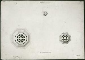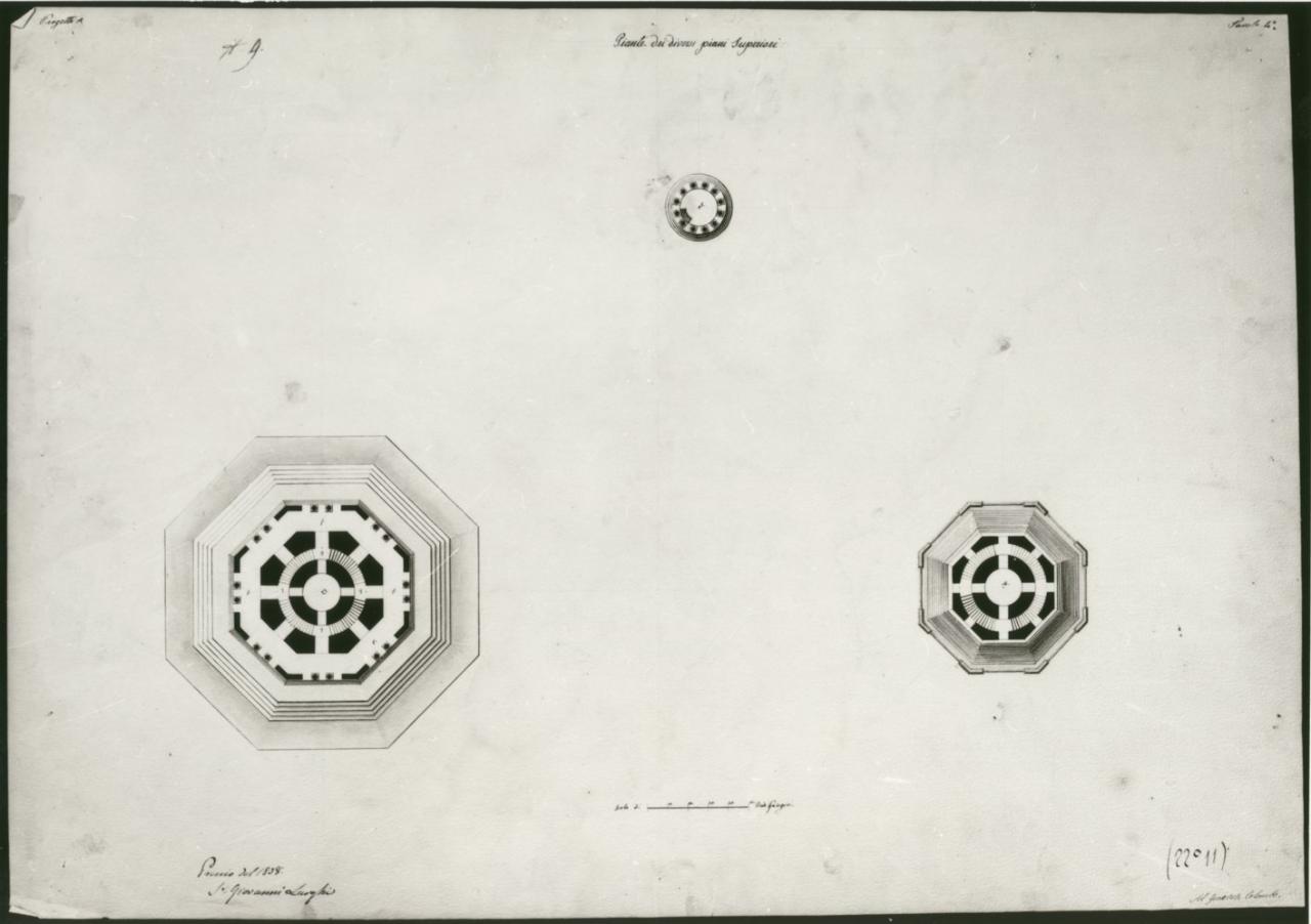 Sezioni orizzontali della torre a china e bistro su fondo beige.\nInf. Sin.: Pianta ottagonale con vista di un vano centrale circolare e vestiboli adiacenti.\nInf. Ds.: Sezione più elevata e ridotta. \nSup. al centro: Sezione dell'elemento di copertura.