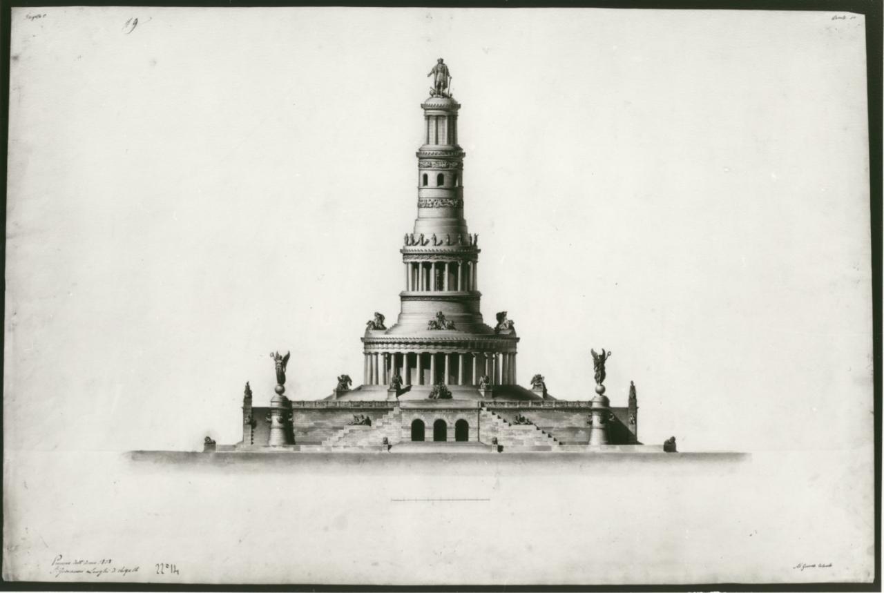 - NOTIZIE STORICO CRITICHE La tavola appartiene ad una serie di nove disegni redatti da Giovanni Larghi per il concorso di I classe dell'anno 1838 dal tema: "Monumento a Cristoforo Colombo all'imboccatura di un porto di mare, che serva anche da faro". Giovanni Larghi, vercellese, è allievo dell'Accademia probabilmente nella seconda metà degli anni '30 del secolo XIX ("Atti...", 1838, p. 32; P. Papagna "I concorsi di architettura" in "Le raccolte storiche dell'Accademia di Brera", a cura di G. Agosti e M. Ceriana, "Quaderni di Brera", n° 8, Firenze 1997, p. 97). I disegni sono conservati nella cartella 16 insieme ai saggi di concorso di I classe compresi tra il 1836 e il 1859.
