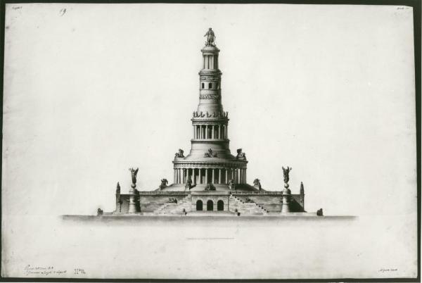 Prospetto di monumento a china e bistro su carta beige. Torre con base circolare a diversi livelli su piattaforma preceduta da 2 rampe di gradinate interrotte da piano con fontane. Agli angoli della piattaforma statue di vittorie alate su sfere. \nSup.: Una gradinata precede il peristilio circolare con colonne tuscaniche e cornicione adorno di gruppi statuari.\nSulla sommità statua di Cristoforo Colombo.