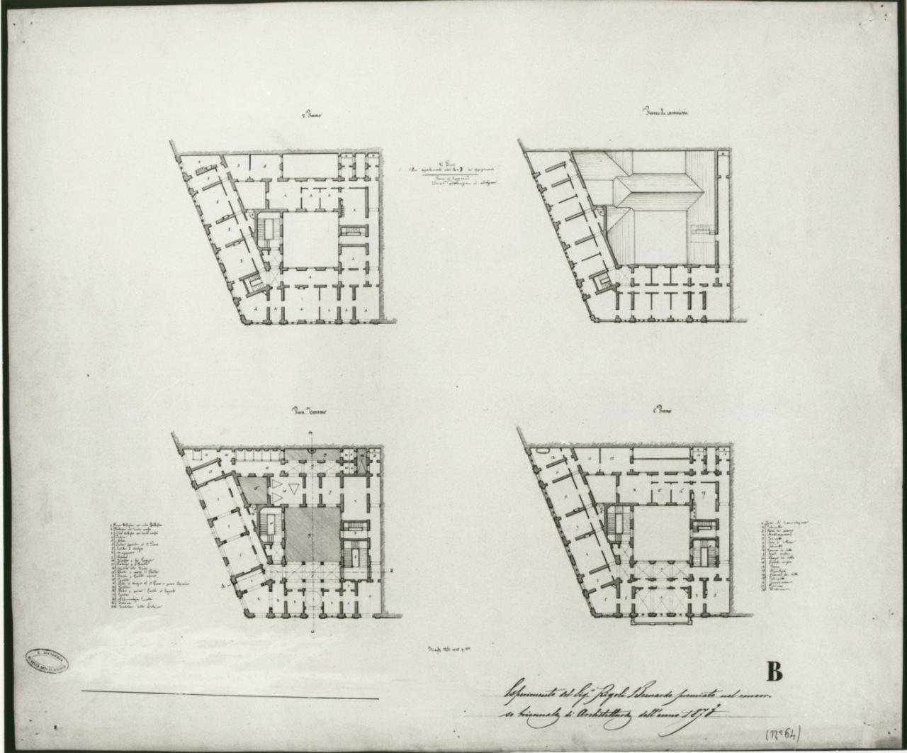 Cartoncino colore beige. Serie di 4 piante di palazzo a china nera.\nIn basso a sinistra pianta del Piano terreno: edificio trapezioidale ad uso abitativo, con cortile centrale quadrato campito con tratteggio obliquo. Ai lati del cortile a sinistra una rampa di scale e a destra due rampe di scale. Sulla linea C D, l'ingresso e l'atrio di distribuzione agli ambienti circostanti. A sinistra e sul lato superiore cavedi campiti con tratteggio obliquo. All'interno dei vani numeri di riferimento alla leggenda posta a sinistra del disegno. \nIn basso a destra primo piano: pianta di edificio trapezioidale con cortile centrale quadrato. All'interno dei vani numeri di riferimento alla leggenda posta a destra del disegno. \nIn alto a sinistra pianta del secondo piano: edificio trapezioidale con cortile centrale quadrato. \nIn alto a destra pianta del piano superiore con vista delle coperture a falda.