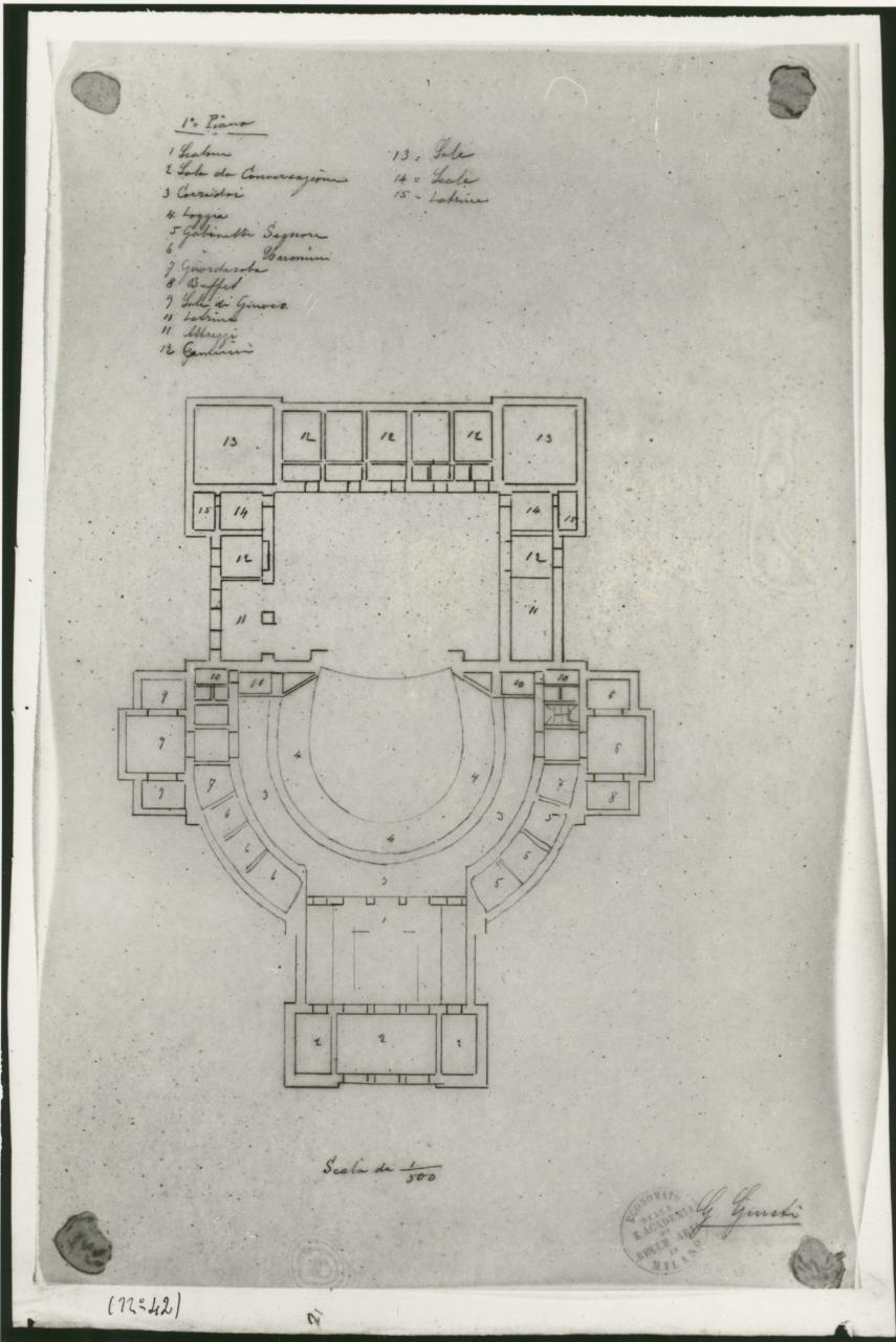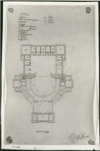 Disegno a matita della pianta di un teatro con vestibolo rettangolare d'accesso, platea semicircolare e palcoscenico quadrato delimitato da diversi vani di forma quadrata o rettangolare. All'interno dei vani numeri di riferimento a leggenda posta in alto a sinistra.