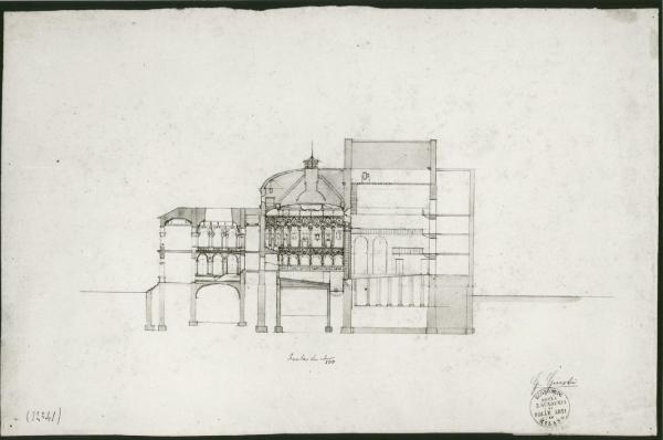 Disegno della sezione di un teatro a matita con murature sezionate campite in acquerello grigio. Vista dell'atrio con due ordini di archi a tutto sesto, della platea con tre ordini di palchi e sezione del lucernario che illumina la sala. Vista interna del palcoscenico e dei camerini.