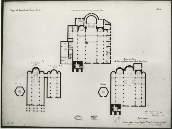 Cartoncino colore beige. La tavola contiene tre piante di edificio ecclesiale con murature sezionate campite a china nera. In alto al centro pianta basilicale con navata centrale e navatelle ai lati. Absidi semicircolari. \nInferiormente a sinistra doppia pianta basilicale (a tre navate) con annesso battistero esagonale. \nInferiormente a destra pianta basilicale a cinque navate con absidi semicircolari ed esternamente battistero esagonale.