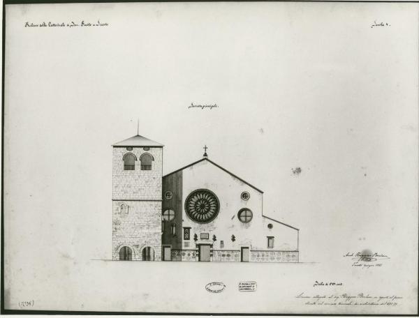 Cartoncino colore beige. Disegno della facciata della cattedrale con ombreggiature e parti a tratteggio eseguite in china. Complesso composto da:\na sinistra torre campanaria, in mattoni, con due archi a tutto sesto al piano terra e superiormente due finestre ad arco sormontate da due aperture ovali, tetto a falde;\nchiesa con al piano terra tre aperture rettangolari, rosone centrale e lateralmente aperture circolari, tetto a falde. \nAl piano terra serie di tavole istoriate.