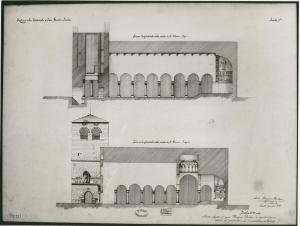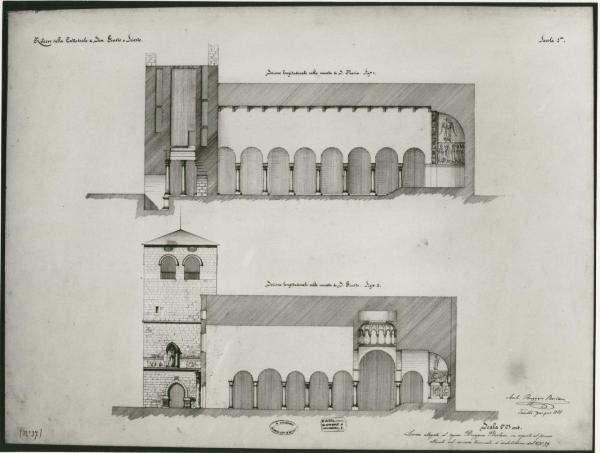 Cartoncino colore beige. La tavola contiene due sezioni longitudinali di edifici ecclesiali edifici a china con ombreggiatura a tratteggio obliquo e verticale. \nIn alto sezione longitudinale della chiesa:\nPronao con colonne e vista dell'interno della chiesa con serie di otto arcate sostenute da colonne con base, infine abside semicircolare con catena absidale decorata con raffigurazione dettagliata del disegno. \nIn basso sezione longitudinale del complesso con vista della torre campanaria e dell'interno della chiesa con cinque arcate, con zona centrale sormontata da arco e da cupola ribassata sostenuta da serie di archetti a tutto sesto e presbiterio decorato con raffigurazione dettagliata del disegno.