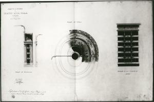 Cartoncino colore beige. La tavola contiene (da sinistra a destra):\ndettaglio del boccascena a matita e acquerelli (disegno dei tendaggi, delle decorazioni dei parapetti dei palchi e delle lesene scanalate con capitello composito); al centro dettaglio del velario con rappresentazione parziale delle decorazioni (eseguite ad acquerello a tinte forti); a destra dettaglio di una serie di palchi.
