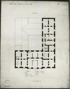 Progetto per edificio postale a china con sezioni campite in nero, legenda in basso in corsivo e quote di misura in corsivo. Pianta rettangolare del primo piano con vista del cortile centrale degli appartamente degli impiegati e parte, superiore a sinistra, della copertura a falde.