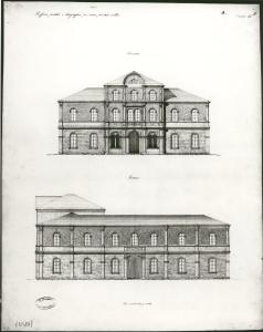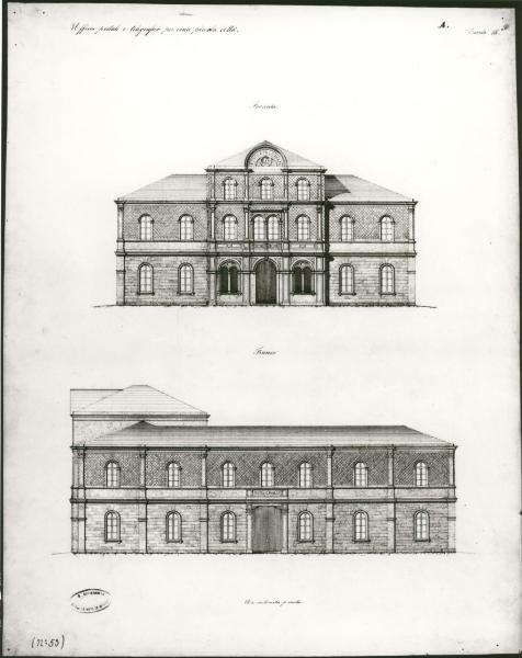 Progetto per un edificio postale a china su fondo chiaro. \nInferiormente: fianco del corpo di fabbrica a due piani con ingresso centrale e facciata con specificate le tessiture murarie. Copertura a falde.\nSuperiormente: prospetto dell'edificio con corpo centrale a tre piani fiancheggiato da struttura a due piani.