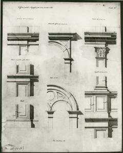 serie di sei particolari architettonici relativi al progetto per edificio postale a matita, su fondo chiaro con sottolineature a china per evidenziare cornici. Inferiormente: zoccolo, bifore dell'atrio e parapetto del primo piano. \nSuperiormente: tre cornici del primo piano.