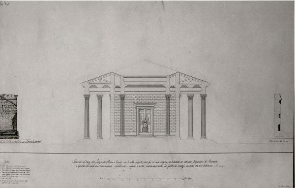 Sezione e rilievo del Tempio a china, tratteggio e acquerello rosato, quotato a china rossa, su sfondo chiaro, entro linea di margine a china. Evidenziato lo stato di degrado. Sin.: rilievo di una porzione del muro esetrno della cella. Centro: Sezione trasversale del tempio con veduta della cella scoperta e del colonnato esterno; al centro della cella: piedistallo sorreggente la statua di "Roma", parete di fondo con porta architravata. Sup.: sezione dei lacunari e vedute delle capriate del tetto.