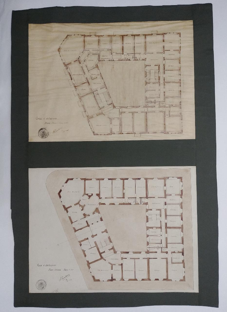 Progetto per casa di abitazione a china marrone composto da 2 piante, una su carta e l'altra su carta da lucido incollate su cartoncino marrone chiaro e bordo sup. incollato verde scuro. Inf.: pianta del piano terra con ingresso sul cortile con 3 scale d'accesso ai piani superiori diviso in 3 appartamenti e alloggio per portiere. Le strutture abitative sono fornite di sale da bagno e alloggi per il personale di servizio. Sup.: pianta su carta da lucido del primo piano diviso in 3 grandi appartamenti forniti di sale da bagno, servizi e camere per la servitù.