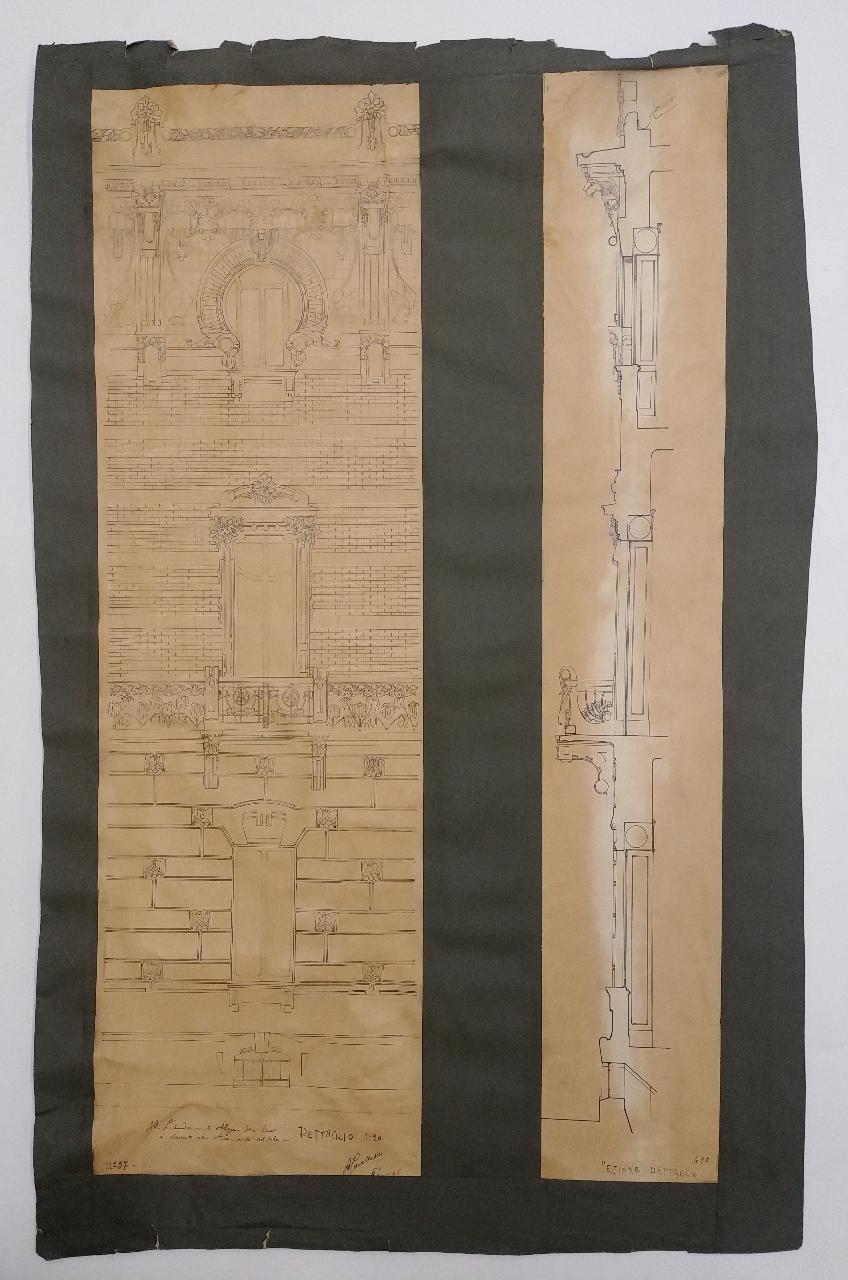 Alzato e sezione di porzione della facciata relativa alla casa d'abitazione a china su carta da lucido ingiallita incollata su cartoncino con bordo sovrapposto verde scuro. Sin.: disegno relativo al programma decorativo terra-tetto in stile liberty comprendente le aperture sulla facciata sovrapposte. Ds.: sezione dello stesso con vista del profilo del terrazzo e della decorazione superiore.