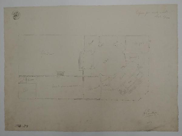 Pianta di edificio a matita su fondo chiaro. Pianta con ingresso angolare preceduto da gradinata con atrio comunicante con vestibolo fornito di due absidi di accesso ad un salone a pianta quadrata con 2 nicchie angolari e apertura verso il giardino posteriore. Adiacenti al vestibolo serie di sale di ricevimento e conversazione, fumoir e sala da gioco.