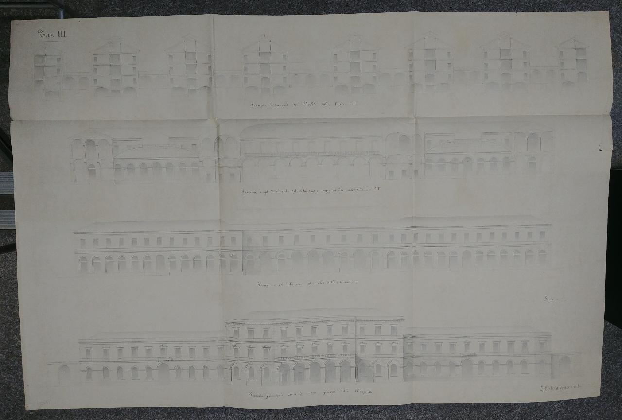 Progetto per la costruzione di una nuova Dogana ed annessi Magazzini di Sostra o Docks. architettura: dogana: caserma (pianta, prospetti e sezioni)