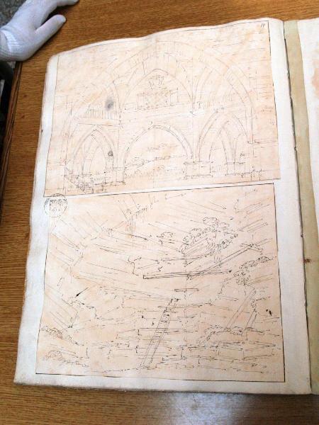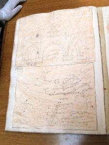 Atrio con veduta di accampamento. Atrio con archi a sesto acuto e veduta di accampamento