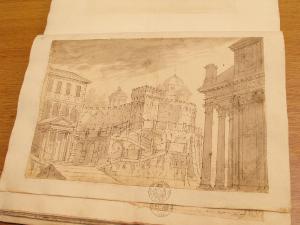 - NOTIZIE STORICO CRITICHE "Scena II, atto I, de 'La clemenza di Tito', Torino, 1760." (Viale Ferrero 1963)\nIl disegno fa parte dell'album "K I 18" recante la scritta "N.9 Rovine Porti di Mare Città esterne Sepolcri e Camere rustiche d'Invenz. di Gio. Galliari in n.o 73". Come per l'album K I 17, questa scritta sembrerebbe successiva ai disegni. Viale Ferrero (1963) precisa che " l'indicazione 'Gio. Galliari' non è esatta; né se si riferisce a Giovanni Antonio perché si trovano molti disegni certo posteriori alla sua morte; né se si riferisce a Giovannino perché molti altri disegni sono datati in anni in cui egli era ancora bambino.