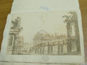 - NOTIZIE STORICO CRITICHE "Databile intorno al 1760. Ricorda i disegni dell'album Pogliaghi" (Viale Ferrero 1963)\nIl disegno fa parte dell'album "K I 18" recante la scritta "N.9 Rovine Porti di Mare Città esterne Sepolcri e Camere rustiche d'Invenz. di Gio. Galliari in n.o 73". Come per l'album K I 17, questa scritta sembrerebbe successiva ai disegni. Viale Ferrero (1963) precisa che " l'indicazione 'Gio. Galliari' non è esatta; né se si riferisce a Giovanni Antonio perché si trovano molti disegni certo posteriori alla sua morte; né se si riferisce a Giovannino perché molti altri disegni sono datati in anni in cui egli era ancora bambino.