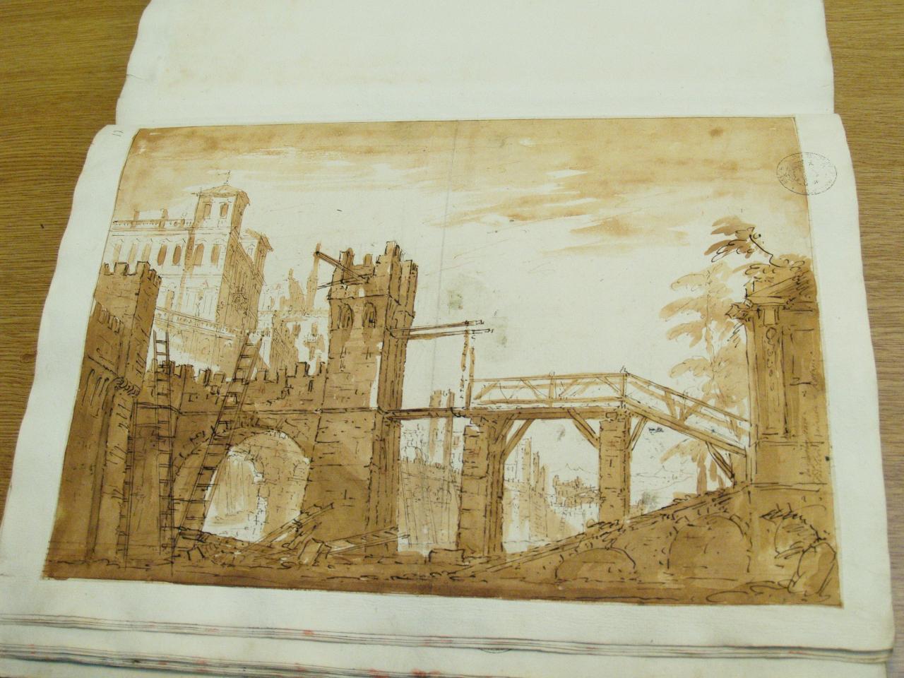 - NOTIZIE STORICO CRITICHE "Non identificato" (Viale Ferrero 1963)\nIl disegno fa parte dell'album "K I 18" recante la scritta "N.9 Rovine Porti di Mare Città esterne Sepolcri e Camere rustiche d'Invenz. di Gio. Galliari in n.o 73". Come per l'album K I 17, questa scritta sembrerebbe successiva ai disegni. Viale Ferrero (1963) precisa che " l'indicazione 'Gio. Galliari' non è esatta; né se si riferisce a Giovanni Antonio perché si trovano molti disegni certo posteriori alla sua morte; né se si riferisce a Giovannino perché molti altri disegni sono datati in anni in cui egli era ancora bambino. Il disegno non è identificato.