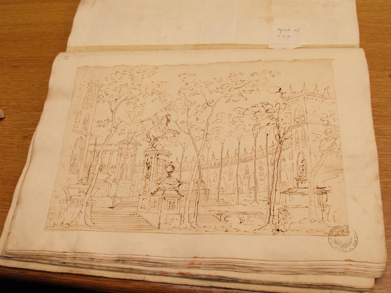 Mura d'anfiteatro con sepolcri e monumento. Interno di anfiteatro con sepolcri, monumento equestre, alberi, scale