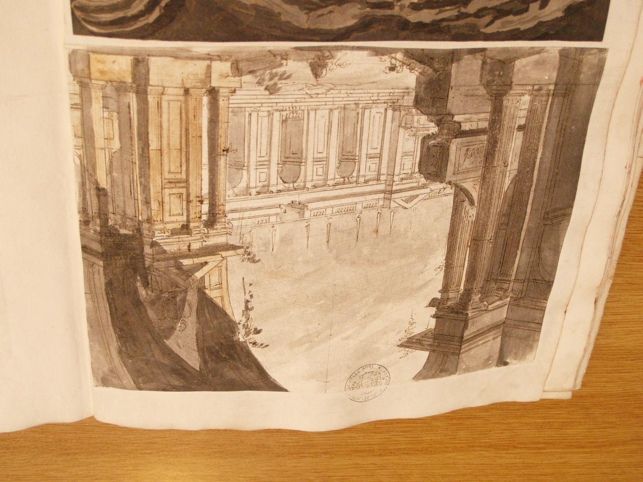 - NOTIZIE STORICO CRITICHE Il disegno fa parte dell'album "K I 18" recante la scritta "N.9 Rovine Porti di Mare Città esterne Sepolcri e Camere rustiche d'Invenz. di Gio. Galliari in n.o 73". Come per l'album K I 17, questa scritta sembrerebbe successiva ai disegni. Viale Ferrero (1963) precisa che " l'indicazione 'Gio. Galliari' non è esatta; né se si riferisce a Giovanni Antonio perché si trovano molti disegni certo posteriori alla sua morte; né se si riferisce a Giovannino perché molti altri disegni sono datati in anni in cui egli era ancora bambino. Disegno non identificato.