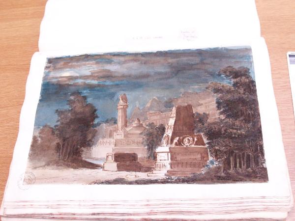 - NOTIZIE STORICO CRITICHE "Molto tardi, di Gaspare." (Viale Ferrero 1963)\nIl disegno fa parte dell'album "K I 18" recante la scritta "N.9 Rovine Porti di Mare Città esterne Sepolcri e Camere rustiche d'Invenz. di Gio. Galliari in n.o 73". Come per l'album K I 17, questa scritta sembrerebbe successiva ai disegni. Viale Ferrero (1963) precisa che " l'indicazione 'Gio. Galliari' non è esatta; né se si riferisce a Giovanni Antonio perché si trovano molti disegni certo posteriori alla sua morte; né se si riferisce a Giovannino perché molti altri disegni sono datati in anni in cui egli era ancora bambino. Disegno non identificato; Viale Ferrero (1963) lo attribuisce a Gaspare Galliari.