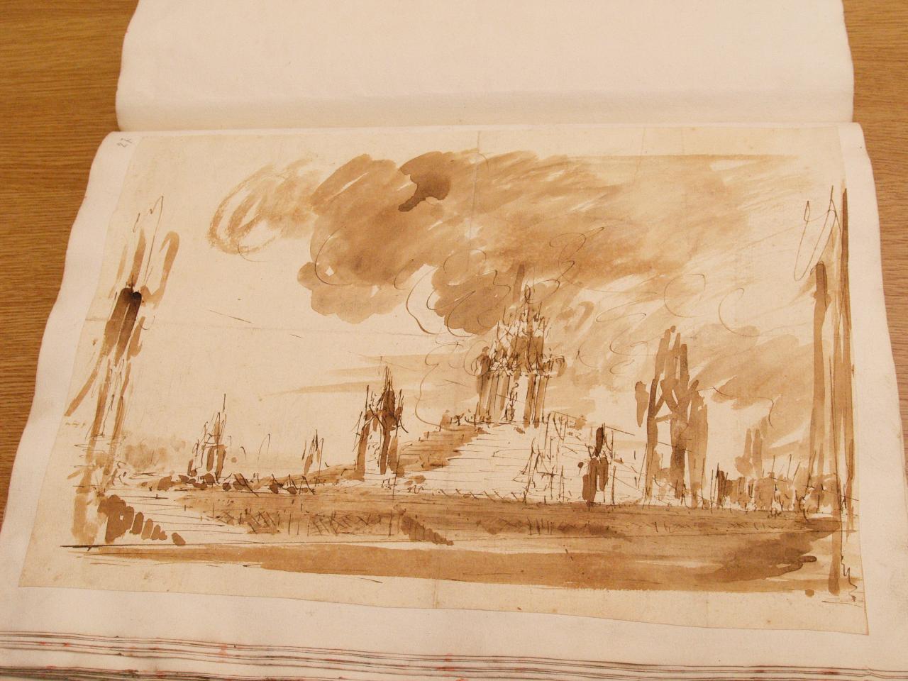 - NOTIZIE STORICO CRITICHE "Non identificato." (Viale Ferrero 1963)\nIl disegno fa parte dell'album "K I 18" recante la scritta "N.9 Rovine Porti di Mare Città esterne Sepolcri e Camere rustiche d'Invenz. di Gio. Galliari in n.o 73". Come per l'album K I 17, questa scritta sembrerebbe successiva ai disegni. Viale Ferrero (1963) precisa che " l'indicazione 'Gio. Galliari' non è esatta; né se si riferisce a Giovanni Antonio perché si trovano molti disegni certo posteriori alla sua morte; né se si riferisce a Giovannino perché molti altri disegni sono datati in anni in cui egli era ancora bambino. Disegno non identificato; Il tratto della pennellata e lo stile pittorico potrebbe far pensare a Bernardino Galliari.