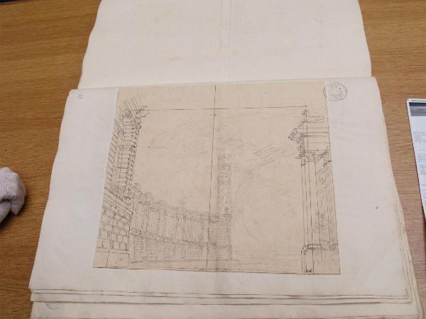 - NOTIZIE STORICO CRITICHE "Non identificato." (Viale Ferrero 1963)\nIl disegno fa parte dell'album "K I 18" recante la scritta "N.9 Rovine Porti di Mare Città esterne Sepolcri e Camere rustiche d'Invenz. di Gio. Galliari in n.o 73". Come per l'album K I 17, questa scritta sembrerebbe successiva ai disegni. Viale Ferrero (1963) precisa che " l'indicazione 'Gio. Galliari' non è esatta; né se si riferisce a Giovanni Antonio perché si trovano molti disegni certo posteriori alla sua morte; né se si riferisce a Giovannino perché molti altri disegni sono datati in anni in cui egli era ancora bambino. Per l'organizzazione fra i vari telari il disegno reca squadratura, la lettera "C", e numeri: in basso a destra "116", in alto al centro "18". Tracce di scritta illegibile in alto a destra.