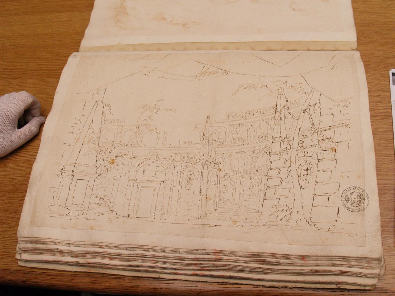- NOTIZIE STORICO CRITICHE "Non identificato." (Viale Ferrero 1963)\nIl disegno fa parte dell'album "K I 18" recante la scritta "N.9 Rovine Porti di Mare Città esterne Sepolcri e Camere rustiche d'Invenz. di Gio. Galliari in n.o 73". Come per l'album K I 17, questa scritta sembrerebbe successiva ai disegni. Viale Ferrero (1963) precisa che " l'indicazione 'Gio. Galliari' non è esatta; né se si riferisce a Giovanni Antonio perché si trovano molti disegni certo posteriori alla sua morte; né se si riferisce a Giovannino perché molti altri disegni sono datati in anni in cui egli era ancora bambino. Il disegno non è identificato; l'edificio prospicente ricorda quello del DS 3303, dell'album K I 17, o il "Vestibolo di un serraglio di fiere", conservato presso il Museo Civico di Torino, realizzato per "Calipso", Torino, 1777.Il disegno è identico al DS 3398, dal quale si differenzia per non essere acquerellato.