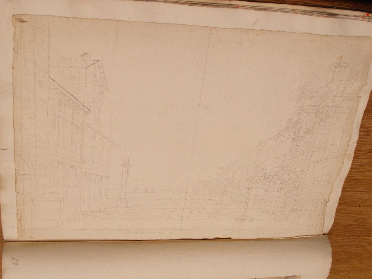 - NOTIZIE STORICO CRITICHE "Il II disegno è il disegno preparatorio per il N. 38." (Viale Ferrero 1963)\nIl disegno fa parte dell'album "K I 18" recante la scritta "N.9 Rovine Porti di Mare Città esterne Sepolcri e Camere rustiche d'Invenz. di Gio. Galliari in n.o 73". Come per l'album K I 17, questa scritta sembrerebbe successiva ai disegni. Viale Ferrero (1963) precisa che " l'indicazione 'Gio. Galliari' non è esatta; né se si riferisce a Giovanni Antonio perché si trovano molti disegni certo posteriori alla sua morte; né se si riferisce a Giovannino perché molti altri disegni sono datati in anni in cui egli era ancora bambino. Disegno non identificato; del tutto identico al DS 3381, di cui dovrebbe essere il disegno preparatorio, dal quale si distingue per essere realizzato solo a matita.