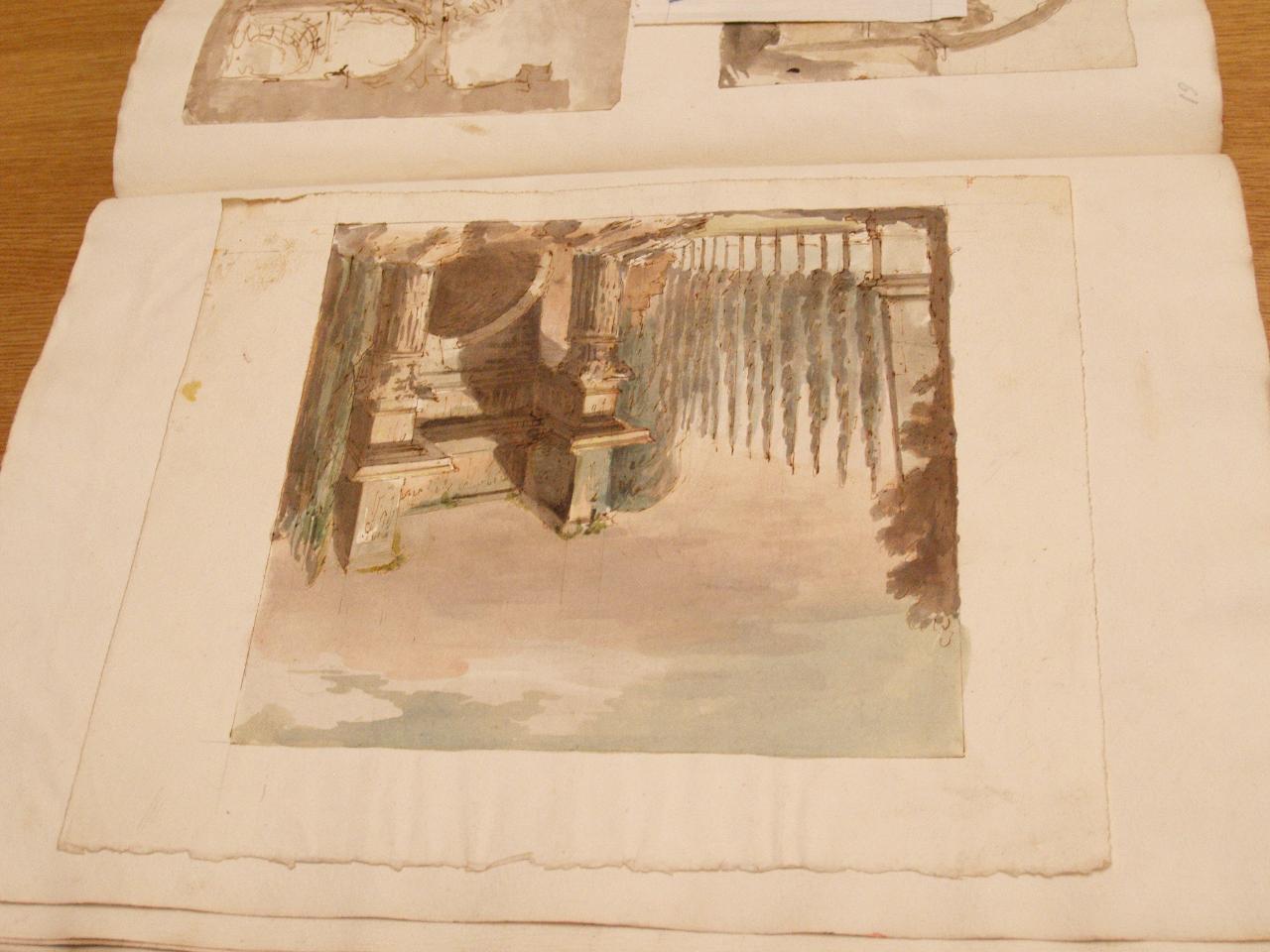 - NOTIZIE STORICO CRITICHE Il disegno fa parte dell'album "K I 18" recante la scritta "N.9 Rovine Porti di Mare Città esterne Sepolcri e Camere rustiche d'Invenz. di Gio. Galliari in n.o 73". Come per l'album K I 17, questa scritta sembrerebbe successiva ai disegni. Viale Ferrero (1963) precisa che " l'indicazione 'Gio. Galliari' non è esatta; né se si riferisce a Giovanni Antonio perché si trovano molti disegni certo posteriori alla sua morte; né se si riferisce a Giovannino perché molti altri disegni sono datati in anni in cui egli era ancora bambino. Disegno non identificato, molto tardo.