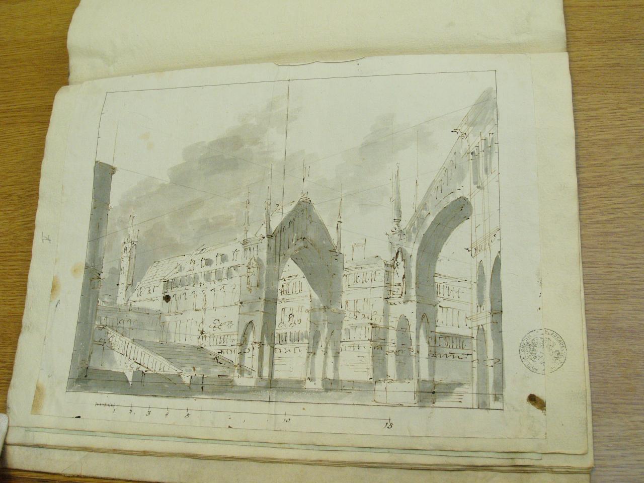 - NOTIZIE STORICO CRITICHE "Di mano di Gaspare." (Viale Ferrero 1963)\nIl disegno fa parte dell'album "K I 18" recante la scritta "N.10 Decorazioni Gotiche d'Invenzione di Gio. Galliari in n. 29." Come per l'album K I 17 e K I 18, questa scritta sembrerebbe successiva ai disegni. Viale Ferrero (1963) precisa che " l'indicazione 'Gio. Galliari' non è esatta; né se si riferisce a Giovanni Antonio perché si trovano molti disegni certo posteriori alla sua morte; né se si riferisce a Giovannino perché molti altri disegni sono datati in anni in cui egli era ancora bambino. A differenza degli album K I 17 e K I 18, i fogli del K I 19 recano la numerazione romana. L'album ha partecipato a "Mostra del barocco piemontese", Torino 1963: l'Accademia conserva documentazione precedentemente allegata all'album. Il disegno reca in basso una scala grafica per la riduzione; è uguale al DS 3422. Il DS 3423 propone uno schizzo meno preciso, più operativo.