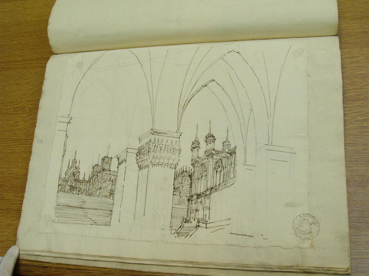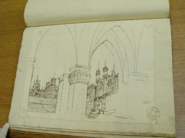 - NOTIZIE STORICO CRITICHE "I disegni non sono identificati. La datazione non è sempre determinabile con una certa approssimazione." (Viale Ferrero 1963)\nIl disegno fa parte dell'album "K I 18" recante la scritta "N.10 Decorazioni Gotiche d'Invenzione di Gio. Galliari in n. 29". Come per l'album K I 17 e K I 18, questa scritta sembrerebbe successiva ai disegni. Viale Ferrero (1963) precisa che " l'indicazione 'Gio. Galliari' non è esatta; né se si riferisce a Giovanni Antonio perché si trovano molti disegni certo posteriori alla sua morte; né se si riferisce a Giovannino perché molti altri disegni sono datati in anni in cui egli era ancora bambino. A differenza degli album K I 17 e K I 18, i fogli del K I 19 recano la numerazione romana. L'album ha partecipato a "Mostra del barocco piemontese", Torino 1963: l'Accademia conserva documentazione precedentemente allegata all'album. Il disegno non è identificato.