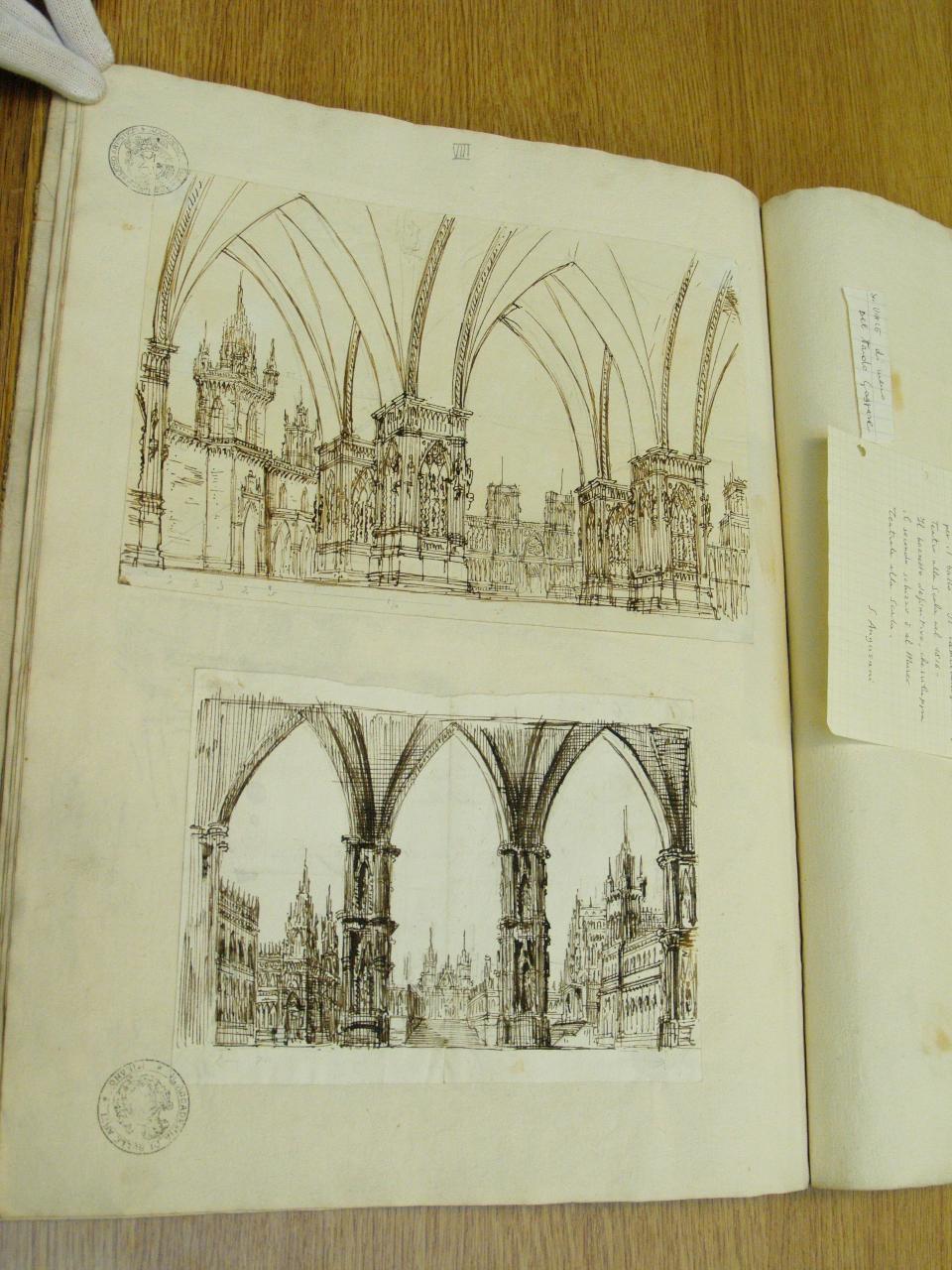 - NOTIZIE STORICO CRITICHE "Tardi, di mano di Gaspare." (Viale Ferrero 1963)\nUna nota manoscritta a firma "S. Angrisani", inserita nell'album, riferendosi a questo disegno e al successivo afferma: "Rispettivamente prima idea e studio per il ballo "Il Tamerlano" dato al Teatro alla Scala nel 1816. Il bozzetto definitivo, che sviluppa il secondo schizzo è al Museo Teatrale alla Scala."\nIl disegno fa parte dell'album "K I 18" recante la scritta "N.10 Decorazioni Gotiche d'Invenzione di Gio. Galliari in n. 29". Come per l'album K I 17 e K I 18, questa scritta sembrerebbe successiva ai disegni. Viale Ferrero (1963) precisa che " l'indicazione 'Gio. Galliari' non è esatta; né se si riferisce a Giovanni Antonio perché si trovano molti disegni certo posteriori alla sua morte; né se si riferisce a Giovannino perché molti altri disegni sono datati in anni in cui egli era ancora bambino. A differenza degli album K I 17 e K I 18, i fogli del K I 19 recano la numerazione romana. L'album ha partecipato a "Mostra del barocco piemontese", Torino 1963: l'Accademia conserva documentazione precedentemente allegata all'album. Secondo Angrisani (1983), il disegno è un'idea per il ballo di "Il Tamerlano", andato in scena al Teatro alla Scala nel 1816.