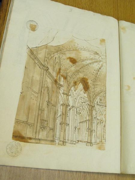 - NOTIZIE STORICO CRITICHE "Non identificato." (Viale Ferrero 1963)\nIl disegno fa parte dell'album "K I 18" recante la scritta "N.10 Decorazioni Gotiche d'Invenzione di Gio. Galliari in n. 29". Come per l'album K I 17 e K I 18, questa scritta sembrerebbe successiva ai disegni. Viale Ferrero (1963) precisa che " l'indicazione 'Gio. Galliari' non è esatta; né se si riferisce a Giovanni Antonio perché si trovano molti disegni certo posteriori alla sua morte; né se si riferisce a Giovannino perché molti altri disegni sono datati in anni in cui egli era ancora bambino. A differenza degli album K I 17 e K I 18, i fogli del K I 19 recano la numerazione romana. L'album ha partecipato a "Mostra del barocco piemontese", Torino 1963: l'Accademia conserva documentazione precedentemente allegata all'album. Il disegno non è identificato.