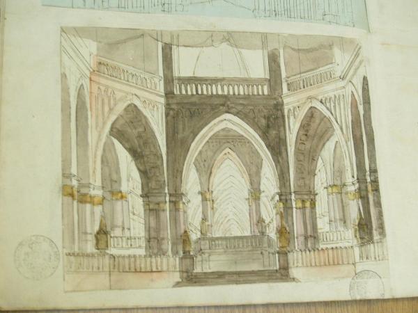 - NOTIZIE STORICO CRITICHE "Tutti disegni tardi." (Viale Ferrero 1963)\nIl disegno fa parte dell'album "K I 18" recante la scritta "N.10 Decorazioni Gotiche d'Invenzione di Gio. Galliari in n. 29". Come per l'album K I 17 e K I 18, questa scritta sembrerebbe successiva ai disegni. Viale Ferrero (1963) precisa che " l'indicazione 'Gio. Galliari' non è esatta; né se si riferisce a Giovanni Antonio perché si trovano molti disegni certo posteriori alla sua morte; né se si riferisce a Giovannino perché molti altri disegni sono datati in anni in cui egli era ancora bambino. A differenza degli album K I 17 e K I 18, i fogli del K I 19 recano la numerazione romana. L'album ha partecipato a "Mostra del barocco piemontese", Torino 1963: l'Accademia conserva documentazione precedentemente allegata all'album. Il disegno, decisamente tardo, non è identificato. Ricorda il DS 3429.