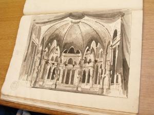 - NOTIZIE STORICO CRITICHE "Si direbbe di Gaspare." (Viale Ferrero 1963)\nIl disegno fa parte dell'album "K I 18" recante la scritta "N.10 Decorazioni Gotiche d'Invenzione di Gio. Galliari in n. 29". Come per l'album K I 17 e K I 18, questa scritta sembrerebbe successiva ai disegni. Viale Ferrero (1963) precisa che " l'indicazione 'Gio. Galliari' non è esatta; né se si riferisce a Giovanni Antonio perché si trovano molti disegni certo posteriori alla sua morte; né se si riferisce a Giovannino perché molti altri disegni sono datati in anni in cui egli era ancora bambino. A differenza degli album K I 17 e K I 18, i fogli del K I 19 recano la numerazione romana. L'album ha partecipato a "Mostra del barocco piemontese", Torino 1963: l'Accademia conserva documentazione precedentemente allegata all'album. Il disegno non è identificato: Viale Ferrero lo attribuisce a Gaspare. Ricorda il DS 3441, dal quale si differenzia per una decorazione meno ricca ed un maggiore chiaroscuro.