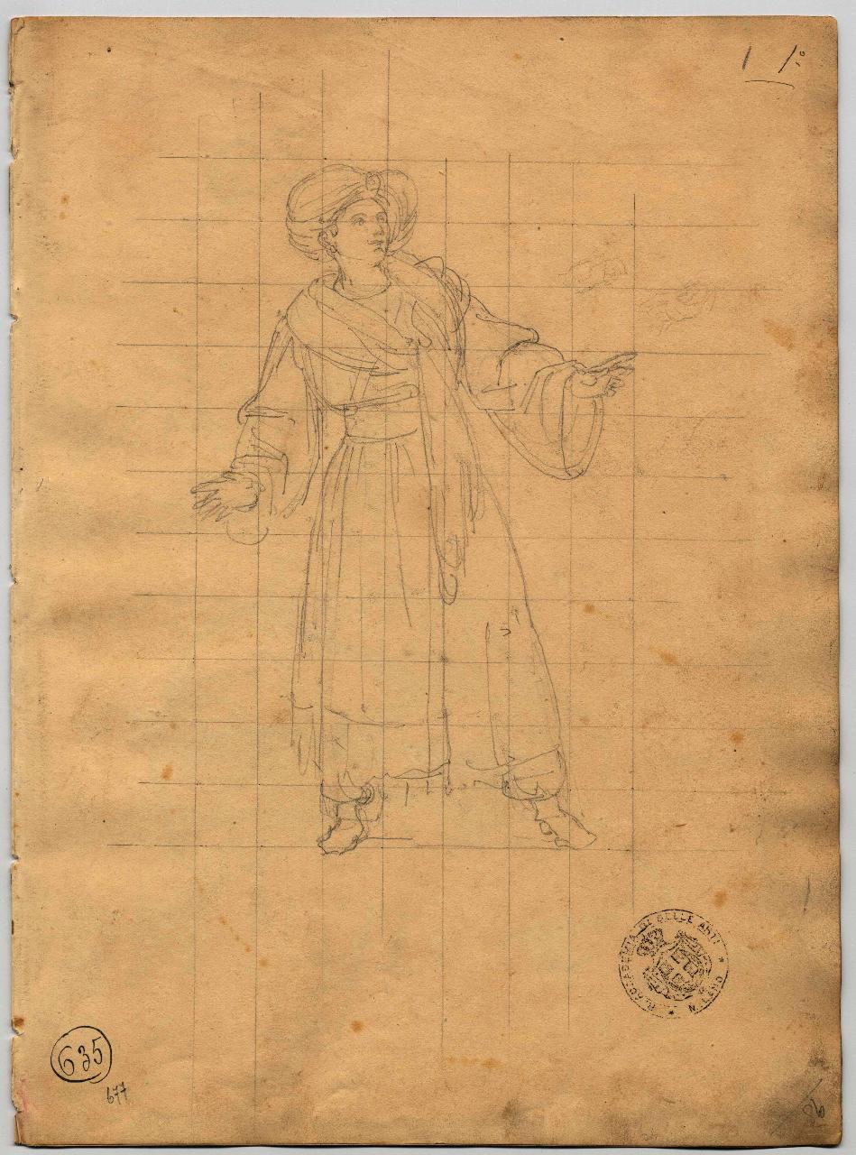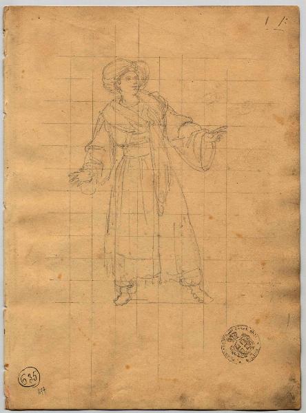 - NOTIZIE STORICO CRITICHE Il disegno, eseguito su carta quadrettata, è stato utilizzato per la figura di Giovanni David, che corrisponde perfettamente. Si colgono differenze solo nel volto del cantante, che nel quadro ha la barba. (M. Tavola)