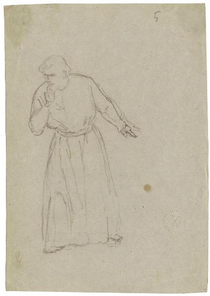 Uomo in tunica che guarda a terra. figura maschile con tunica