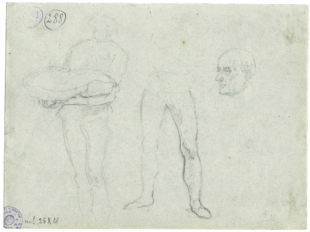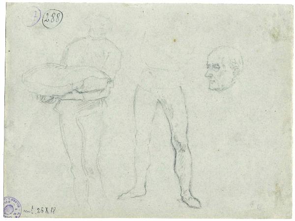Soggetto per quadro storico (Paggio portatore e studio di testa di vecchio in profilo e di gambe)/ Figura d'uomo in farsetto. figure maschili, paggio, testa di vecchio, gambe | figura maschile